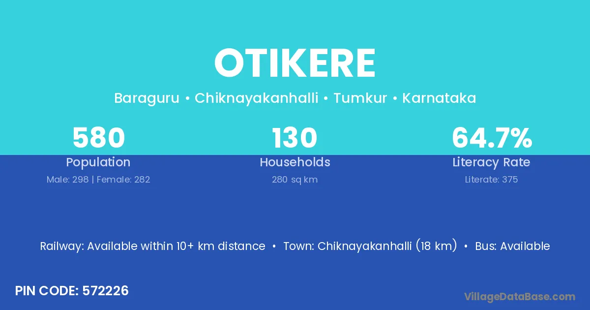 Chiknayakanhalli (18 km) is the nearest town to Otikere village for major economic activities and is located approximately 18 km away.
