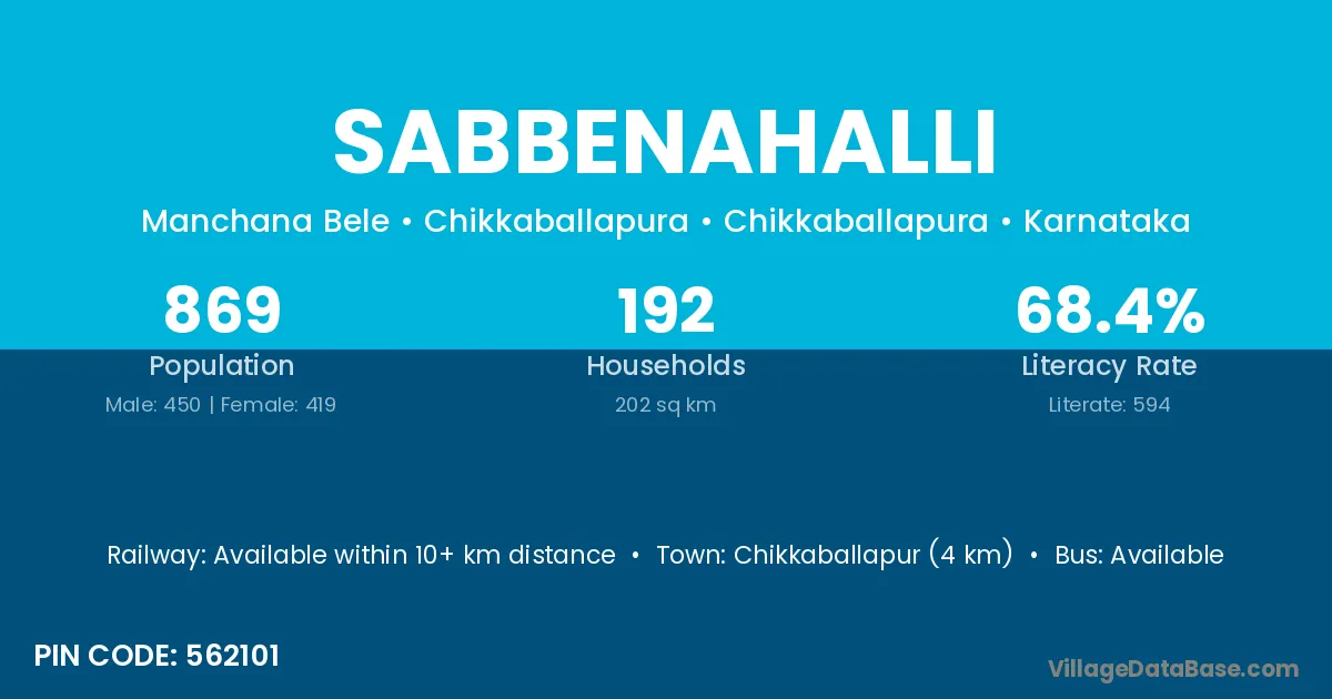 Chiknayakanhalli (36 km) is the nearest town to Sabbenahalli village for major economic activities and is located approximately 36 km away.