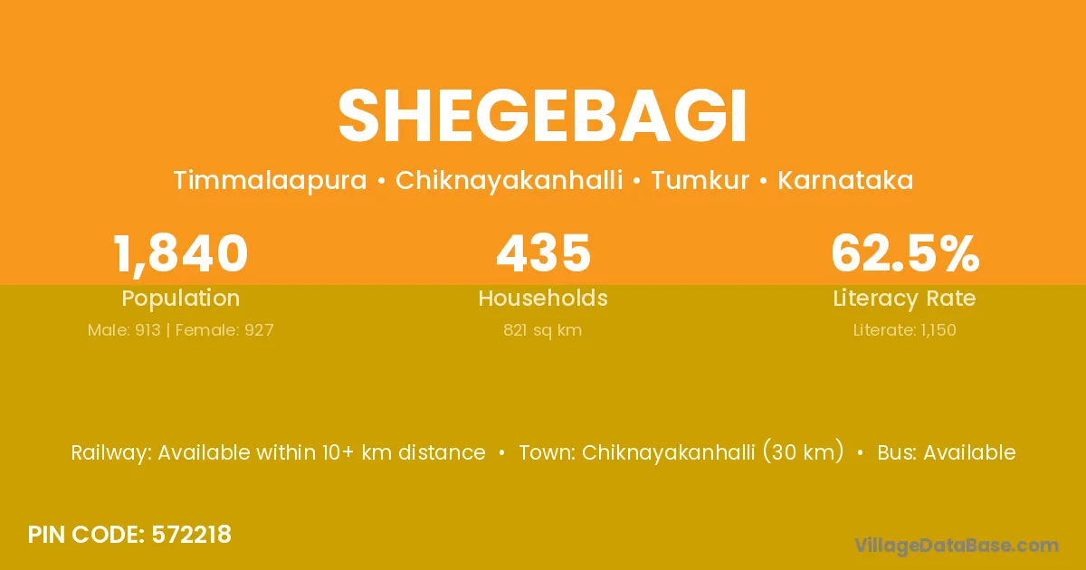 Chiknayakanhalli (30 km) is the nearest town to Shegebagi village for major economic activities and is located approximately 30 km away.