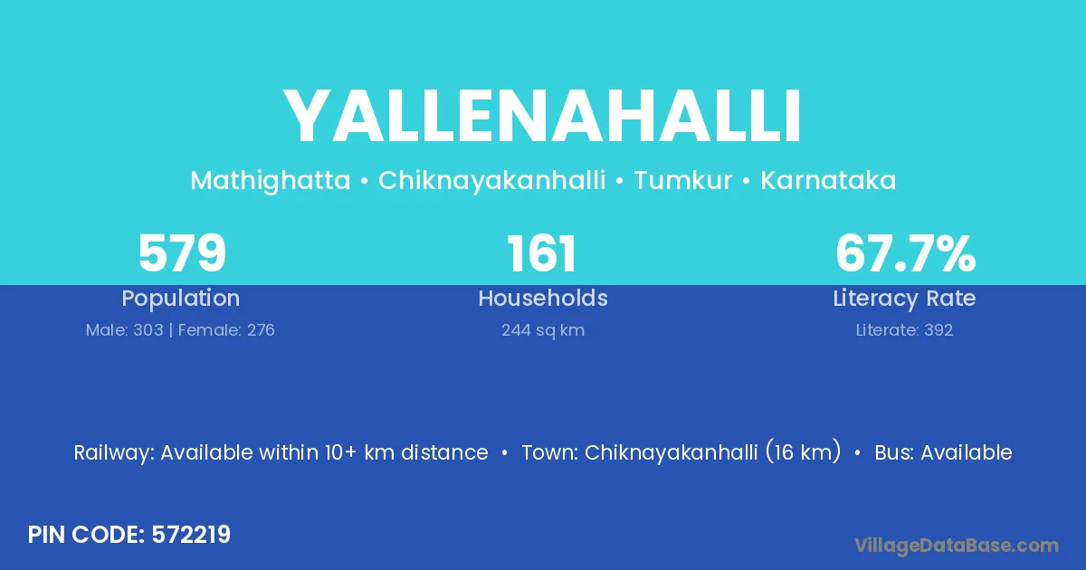 Chiknayakanhalli (16 km) is the nearest town to Yallenahalli village for major economic activities and is located approximately 16 km away.