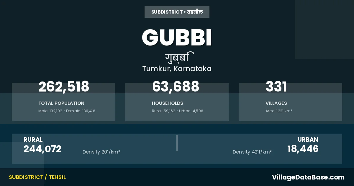 According to the 2011 census The total area of Gubbi Taluka is 1221 km², with a population of 262518 people. The population density is 215 inhabitants per square kilometre, and there are approximately 63688 houses in the sub district.