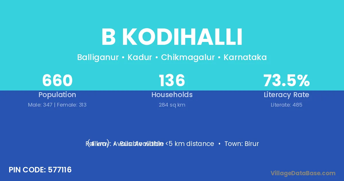 B Kodihalli village has a total population of 647 people, of which 332 are males and 315 are females.