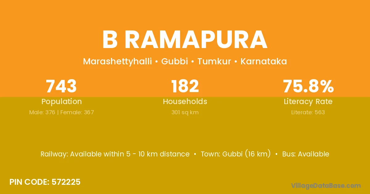 Gubbi (16 km) is the nearest town to B Ramapura village for major economic activities and is located approximately 16 km away.