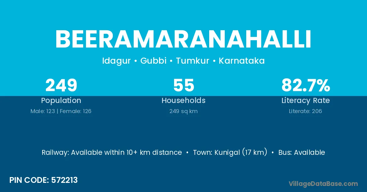 Kunigal (17 km) is the nearest town to Beeramaranahalli village for major economic activities and is located approximately 17 km away.