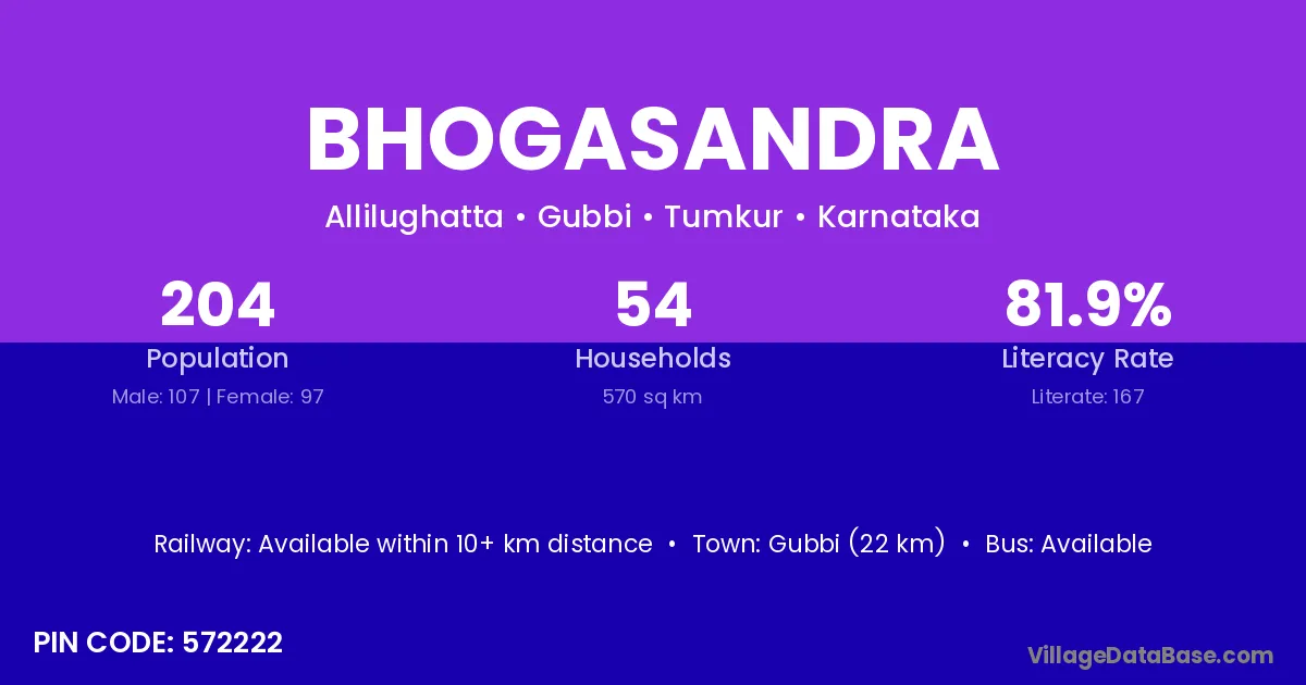 Gubbi (22 km) is the nearest town to Bhogasandra village for major economic activities and is located approximately 22 km away.