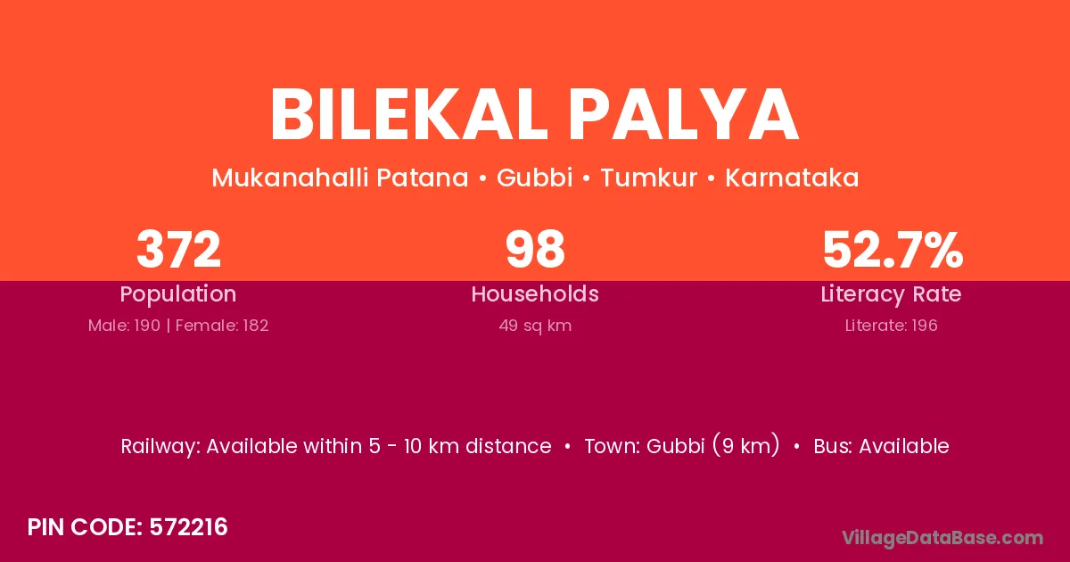 Gubbi (9 km) is the nearest town to Bilekal Palya village for major economic activities and is located approximately 9 km away.