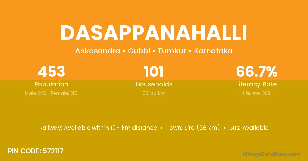 Sira (26 km) is the nearest town to Dasappanahalli village for major economic activities and is located approximately 26 km away.