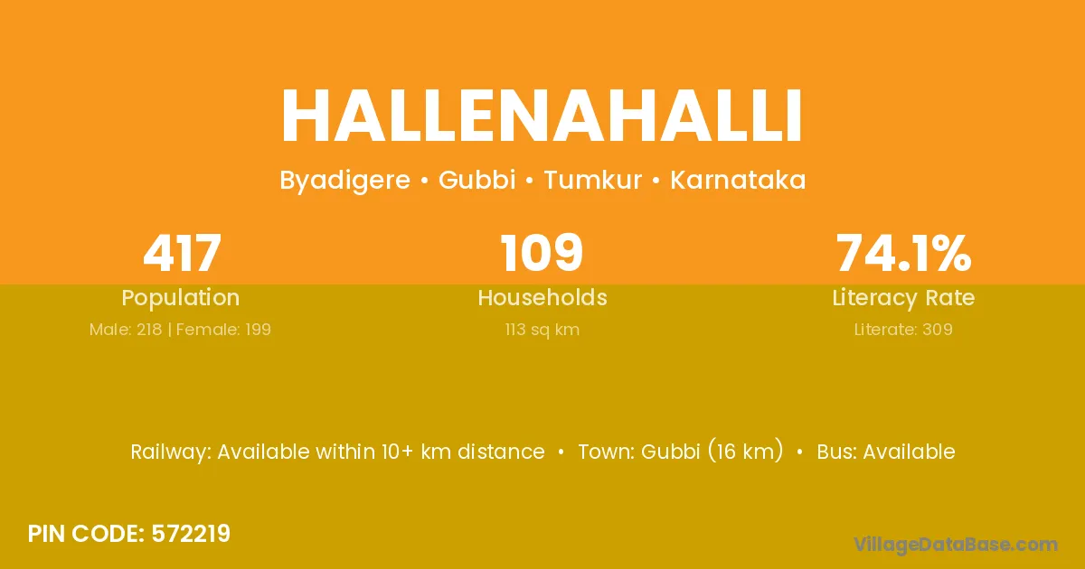 Gubbi (16 km) is the nearest town to Hallenahalli village for major economic activities and is located approximately 16 km away.