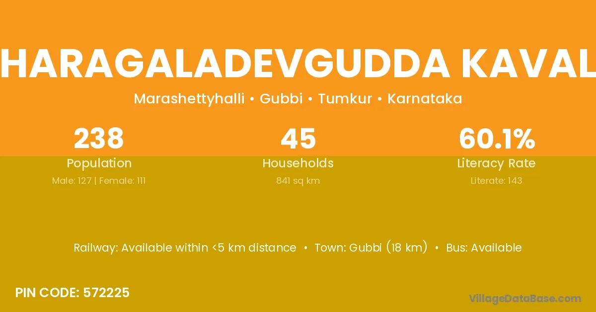 Gubbi (18 km) is the nearest town to Haragaladevgudda Kaval village for major economic activities and is located approximately 18 km away.