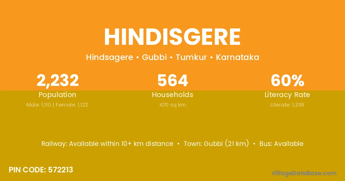 Gubbi (21 km) is the nearest town to Hindisgere village for major economic activities and is located approximately 21 km away.