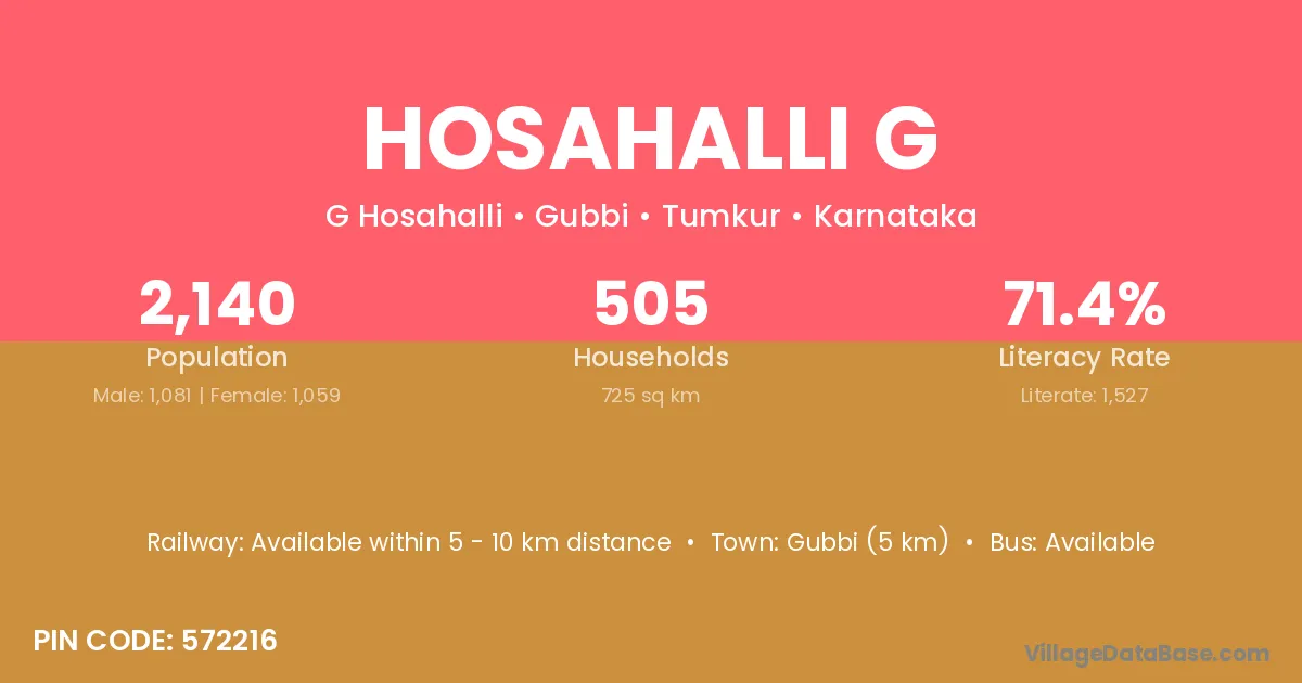 Gubbi (5 km) is the nearest town to Hosahalli G village for major economic activities and is located approximately 5 km away.