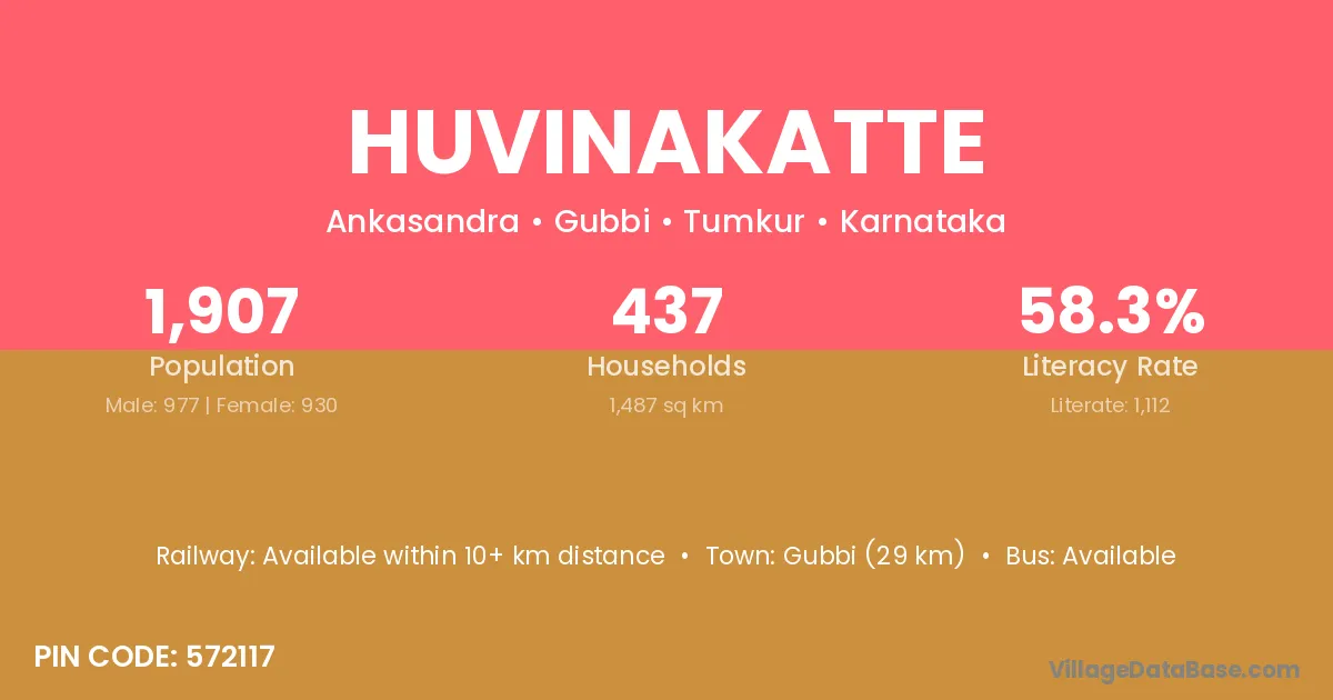 Huvinakatte village has a total population of 1,907 people, of which 977 are males and 930 are females.