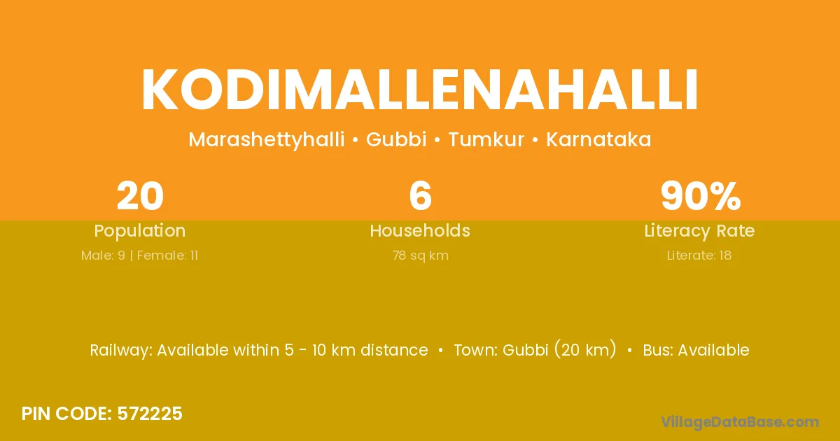 Gubbi (20 km) is the nearest town to Kodimallenahalli village for major economic activities and is located approximately 20 km away.