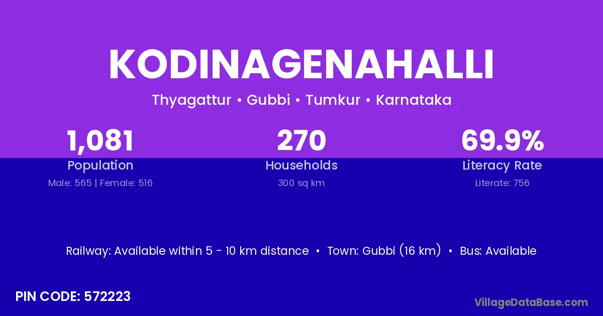 Gubbi (16 km) is the nearest town to Kodinagenahalli village for major economic activities and is located approximately 16 km away.