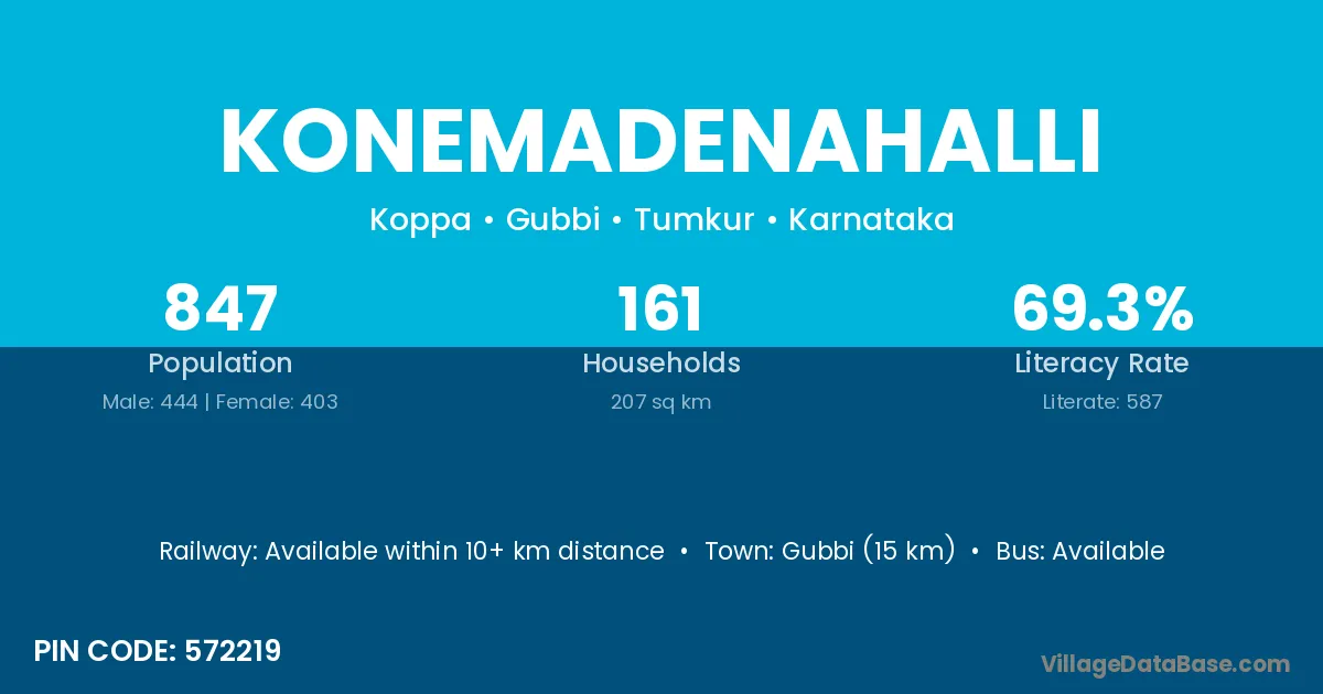 Gubbi (15 km) is the nearest town to Konemadenahalli village for major economic activities and is located approximately 15 km away.