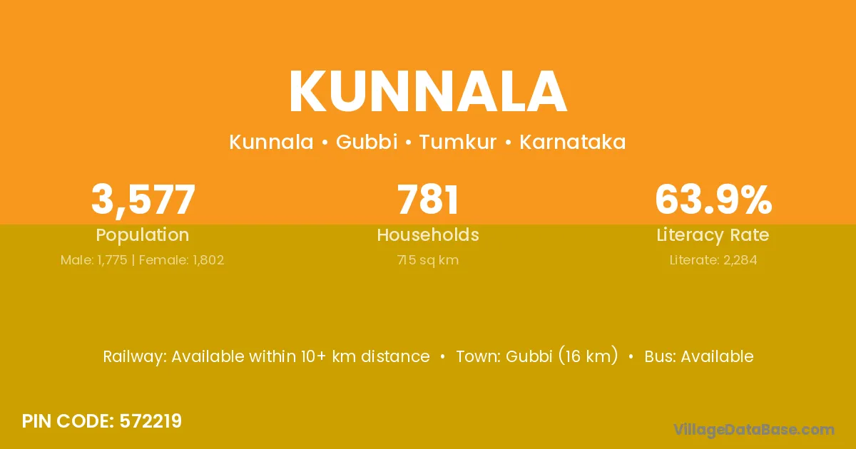 Gubbi (16 km) is the nearest town to Kunnala village for major economic activities and is located approximately 16 km away.