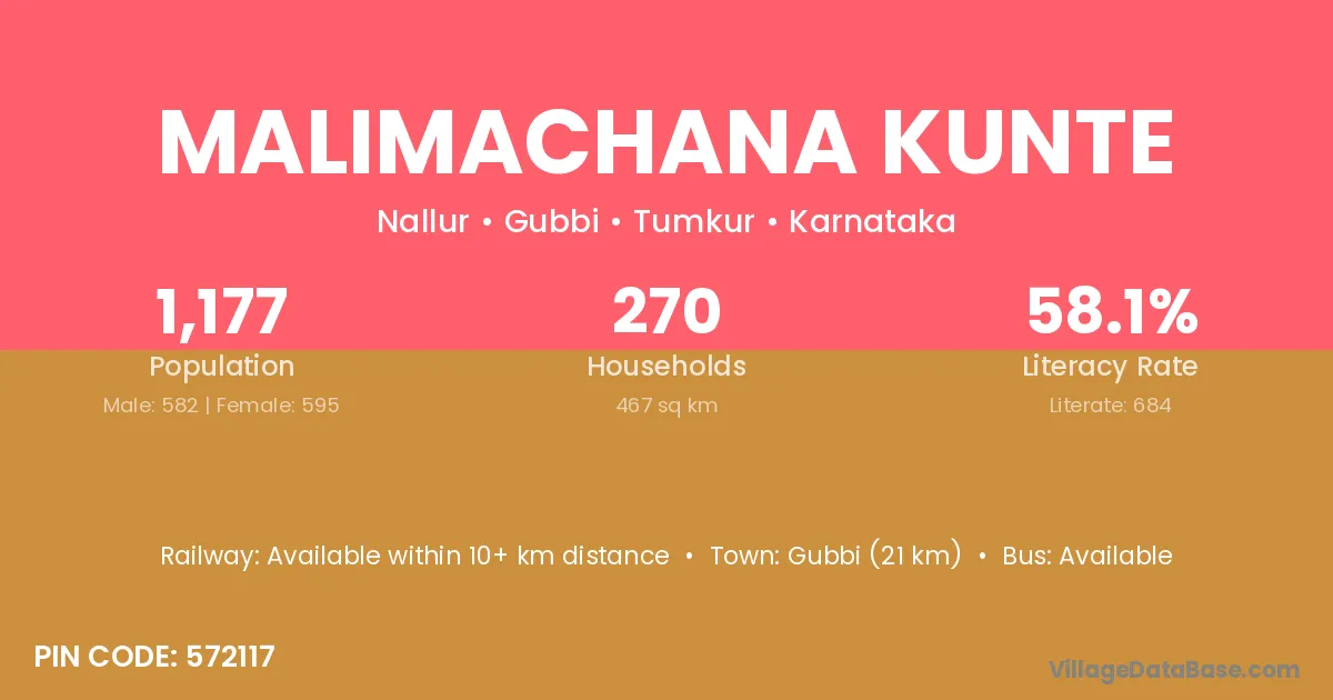 Gubbi (21 km) is the nearest town to Malimachana Kunte village for major economic activities and is located approximately 21 km away.