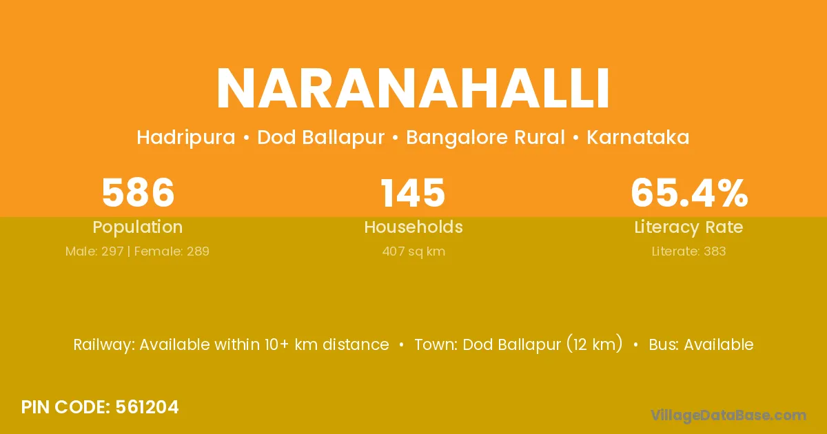 Kunigal (18 km) is the nearest town to Naranahalli village for major economic activities and is located approximately 18 km away.