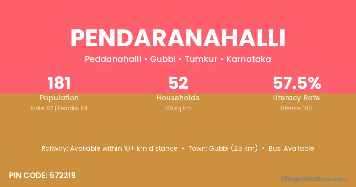 Gubbi (25 km) is the nearest town to Pendaranahalli village for major economic activities and is located approximately 25 km away.