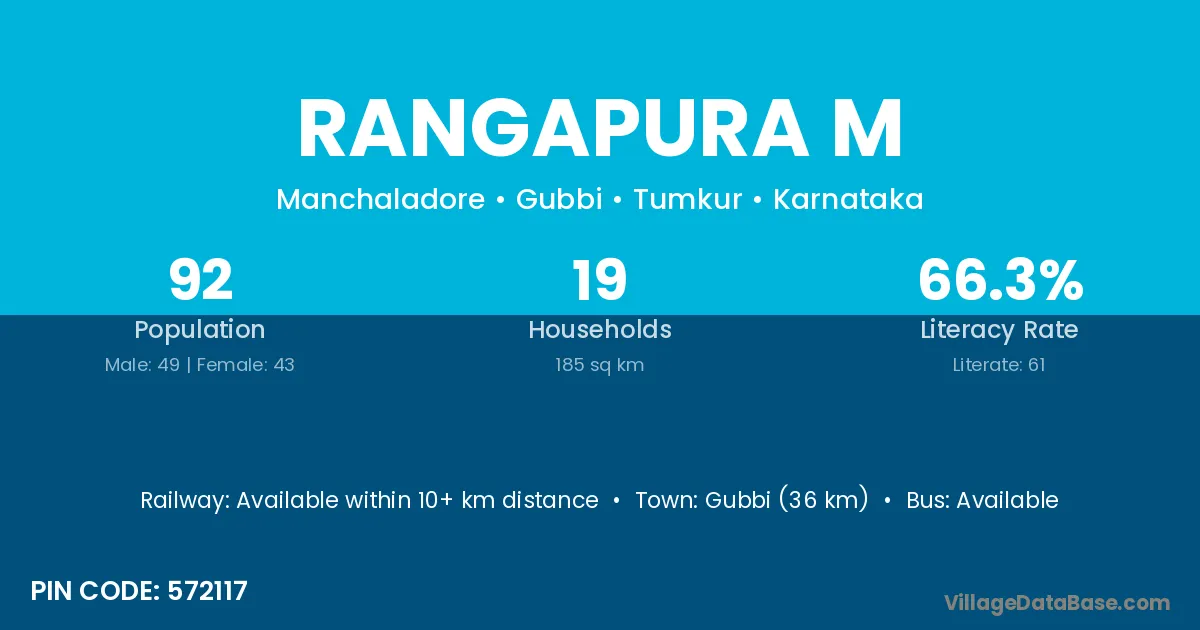 Gubbi (36 km) is the nearest town to Rangapura M village for major economic activities and is located approximately 36 km away.