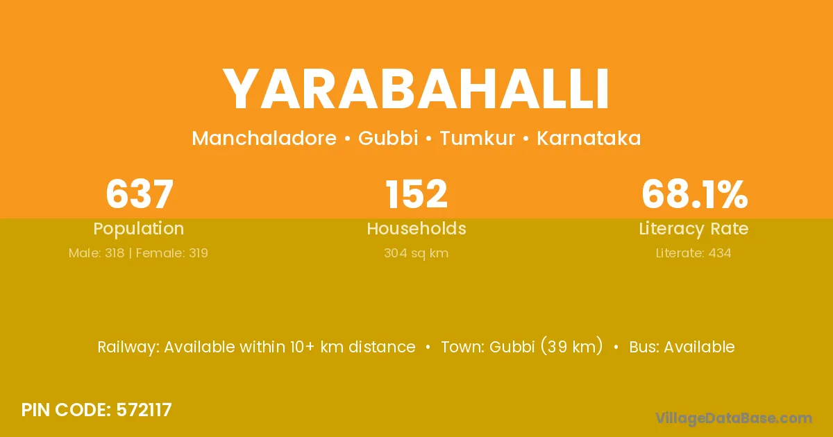 Gubbi (39 km) is the nearest town to Yarabahalli village for major economic activities and is located approximately 39 km away.