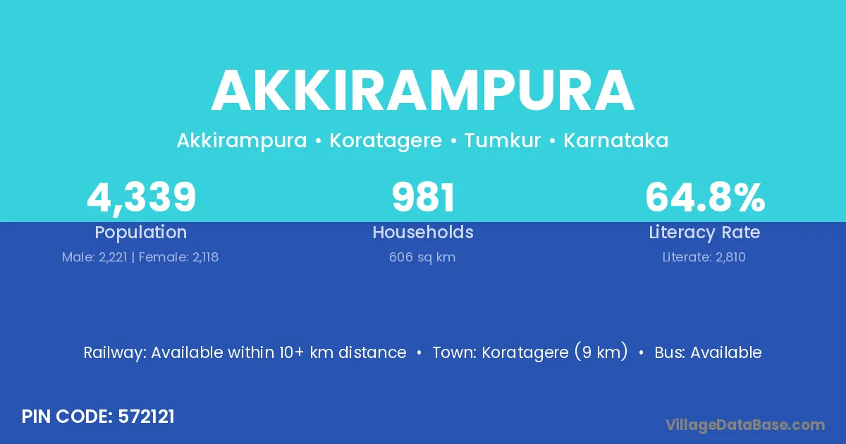 Koratagere (9 km) is the nearest town to Akkirampura village for major economic activities and is located approximately 9 km away.