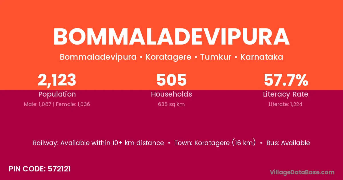 Koratagere (16 km) is the nearest town to Bommaladevipura village for major economic activities and is located approximately 16 km away.