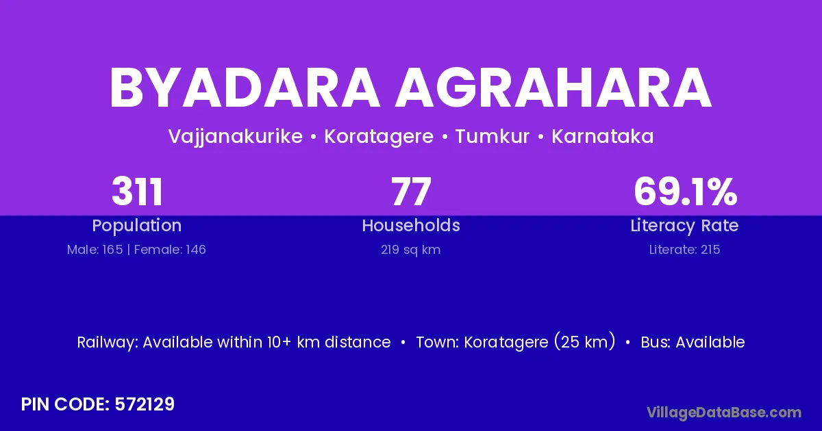 Koratagere (25 km) is the nearest town to Byadara Agrahara village for major economic activities and is located approximately 25 km away.