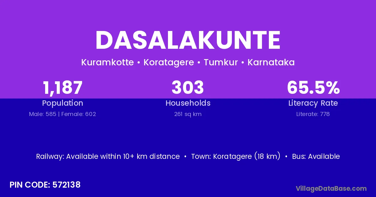 Koratagere (18 km) is the nearest town to Dasalakunte village for major economic activities and is located approximately 18 km away.