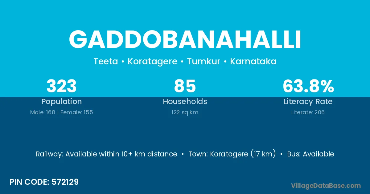 Koratagere (17 km) is the nearest town to Gaddobanahalli village for major economic activities and is located approximately 17 km away.