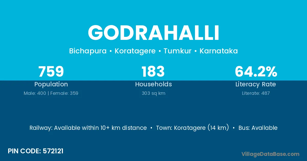 Koratagere (14 km) is the nearest town to Godrahalli village for major economic activities and is located approximately 14 km away.