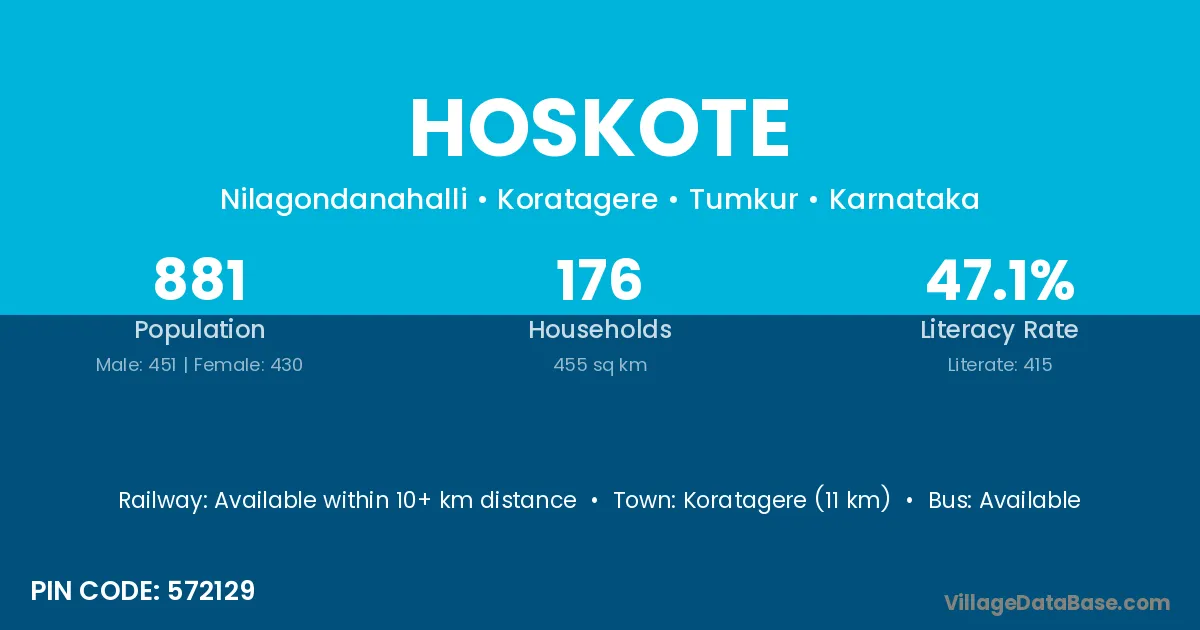 Koratagere (11 km) is the nearest town to Hoskote village for major economic activities and is located approximately 11 km away.