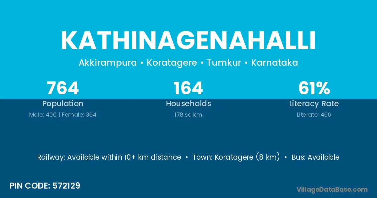Koratagere (8 km) is the nearest town to Kathinagenahalli village for major economic activities and is located approximately 8 km away.