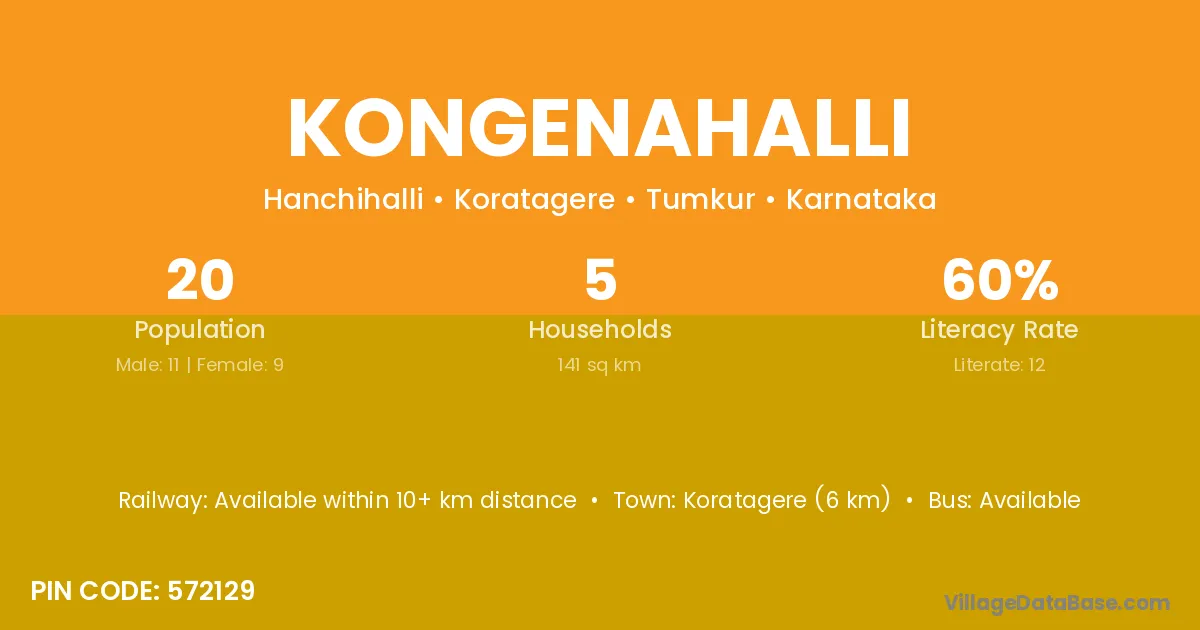 Kongenahalli village has a total population of 20 people, of which 11 are males and 9 are females.