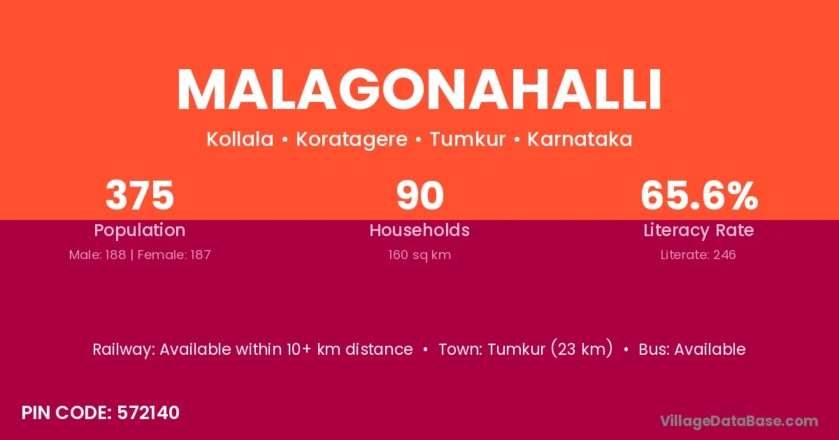 Tumkur (23 km) is the nearest town to Malagonahalli village for major economic activities and is located approximately 23 km away.