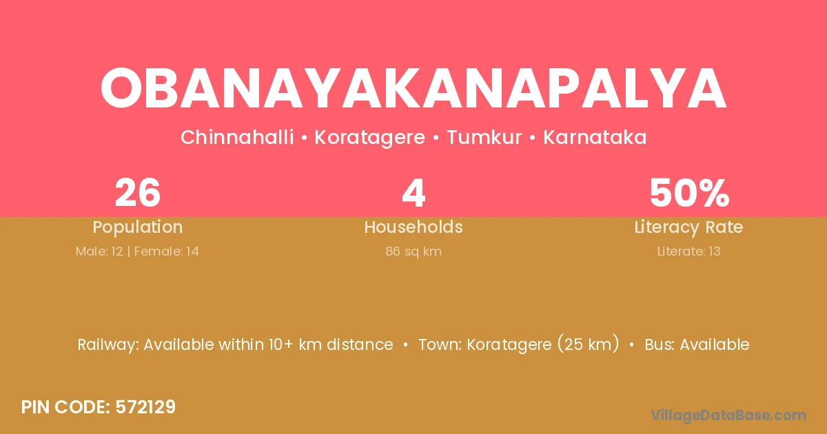 Koratagere (25 km) is the nearest town to Obanayakanapalya village for major economic activities and is located approximately 25 km away.