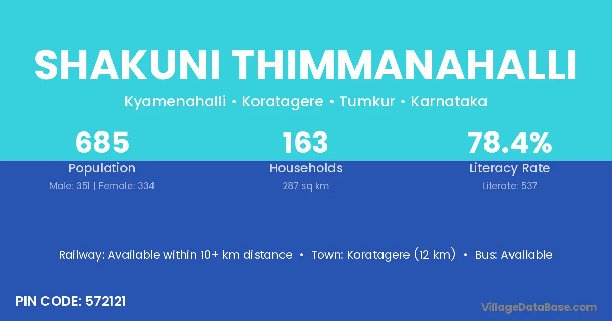 Koratagere (12 km) is the nearest town to Shakuni Thimmanahalli village for major economic activities and is located approximately 12 km away.