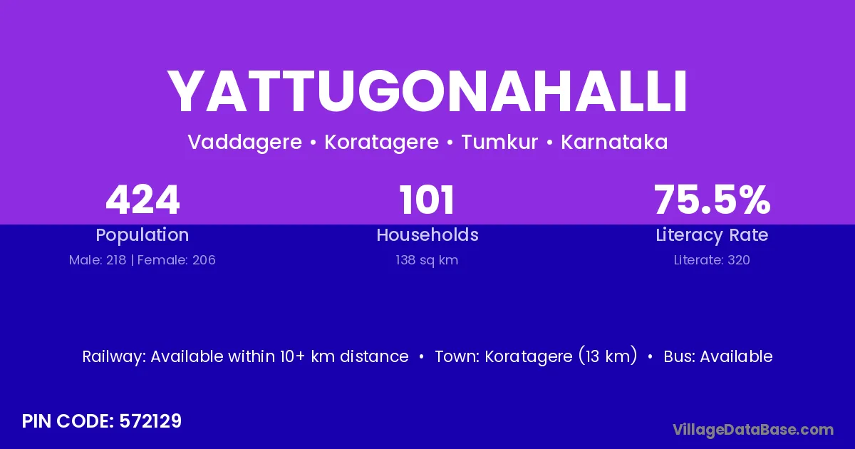 Koratagere (13 km) is the nearest town to Yattugonahalli village for major economic activities and is located approximately 13 km away.