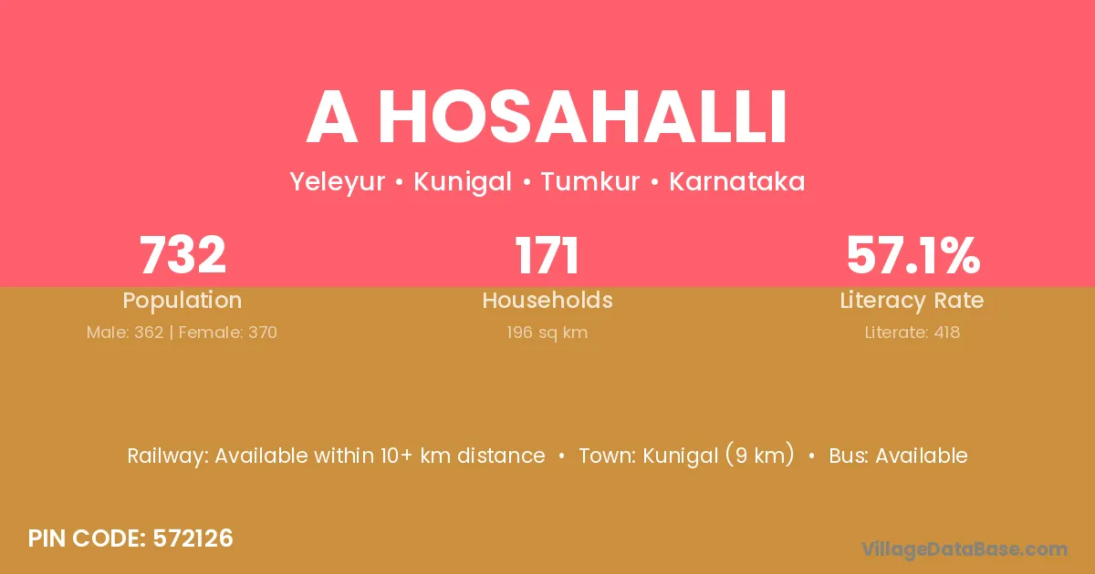 Kunigal (9 km) is the nearest town to A Hosahalli village for major economic activities and is located approximately 9 km away.