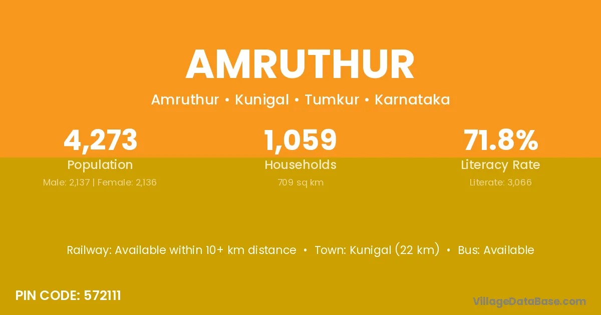 Kunigal (22 km) is the nearest town to Amruthur village for major economic activities and is located approximately 22 km away.