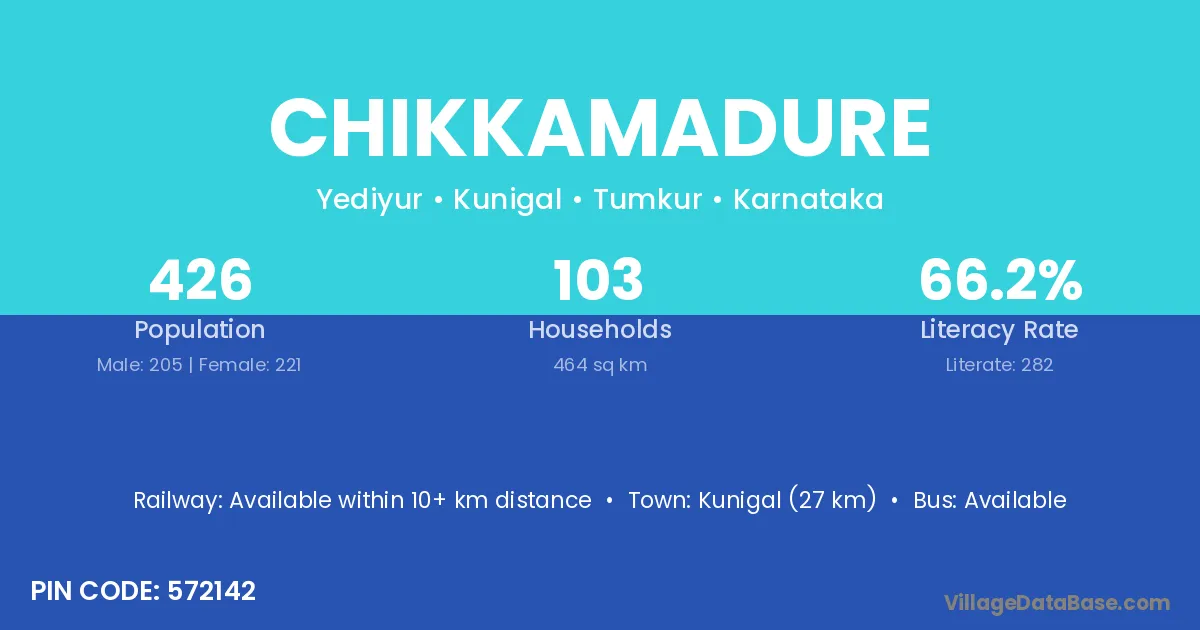 Kunigal (27 km) is the nearest town to Chikkamadure village for major economic activities and is located approximately 27 km away.