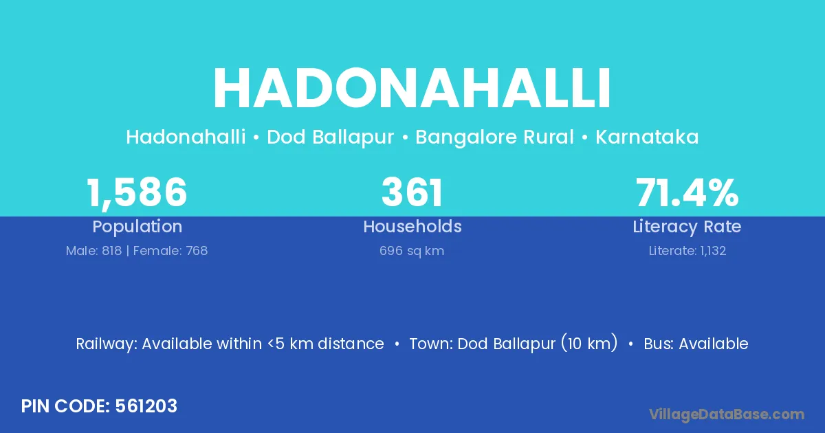 Kunigal (14 km) is the nearest town to Hadonahalli village for major economic activities and is located approximately 14 km away.