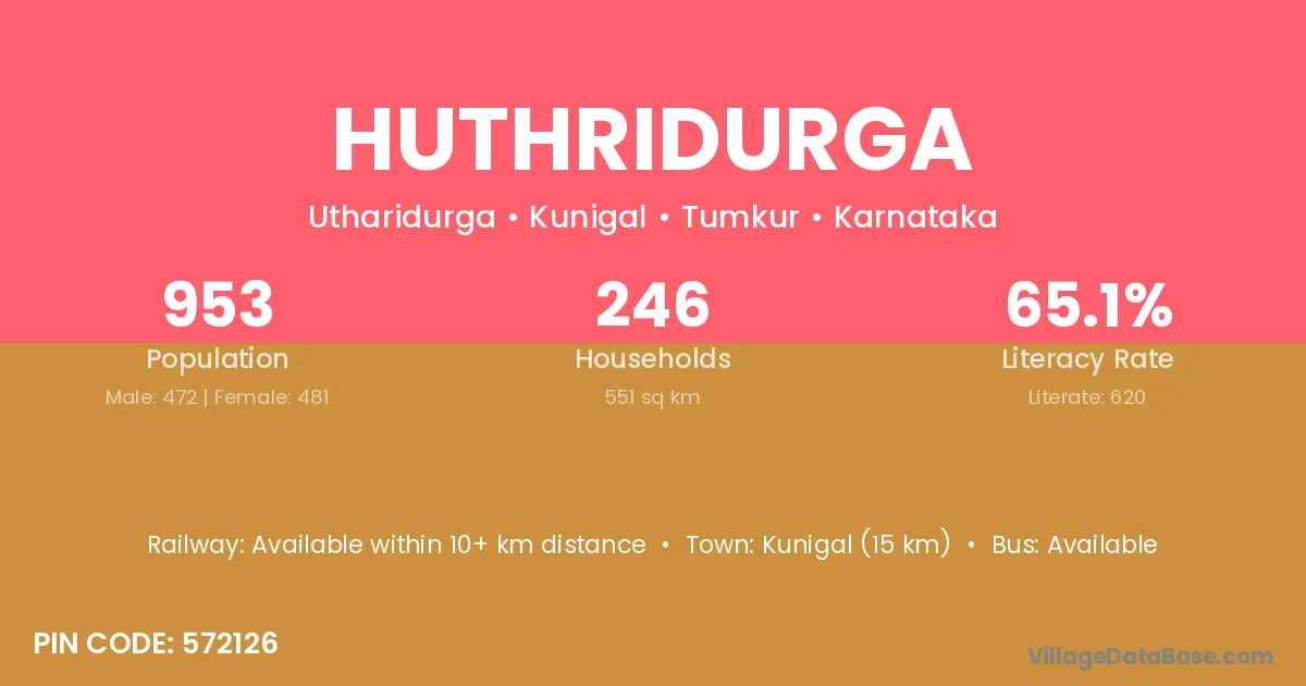 Huthridurga village has a total population of 953 people, of which 472 are males and 481 are females.
