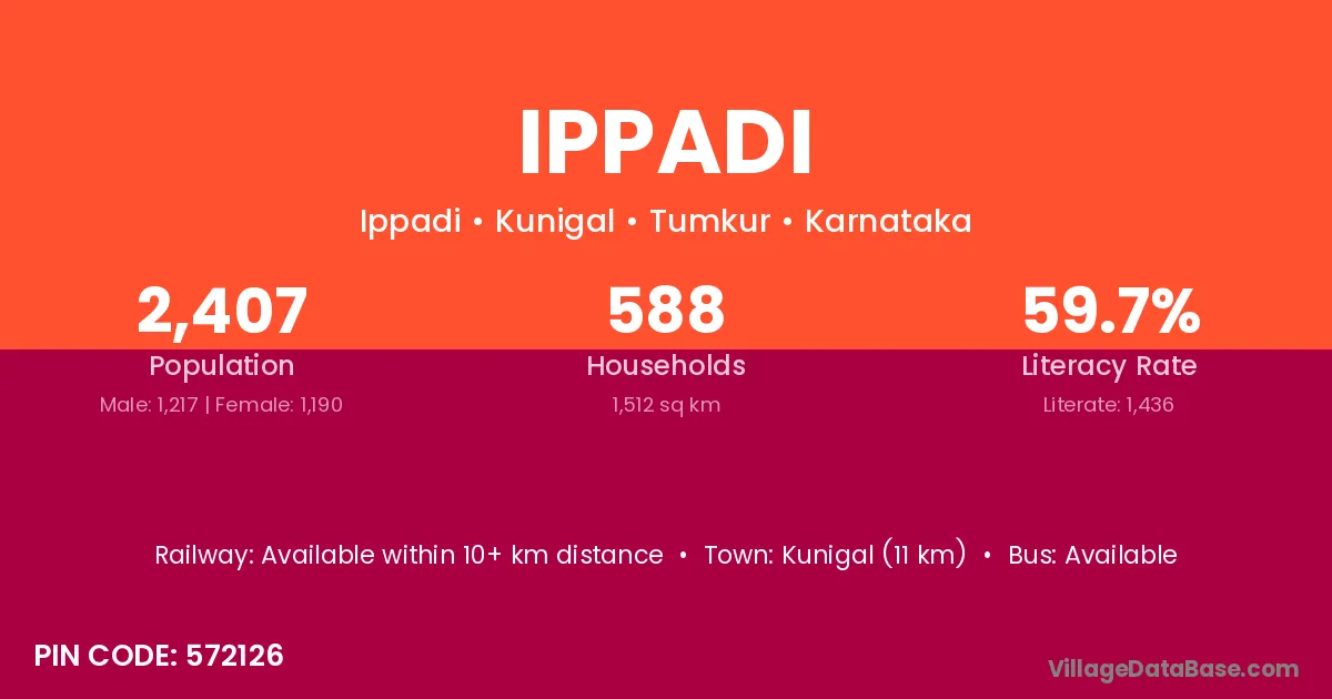 Kunigal (11 km) is the nearest town to Ippadi village for major economic activities and is located approximately 11 km away.