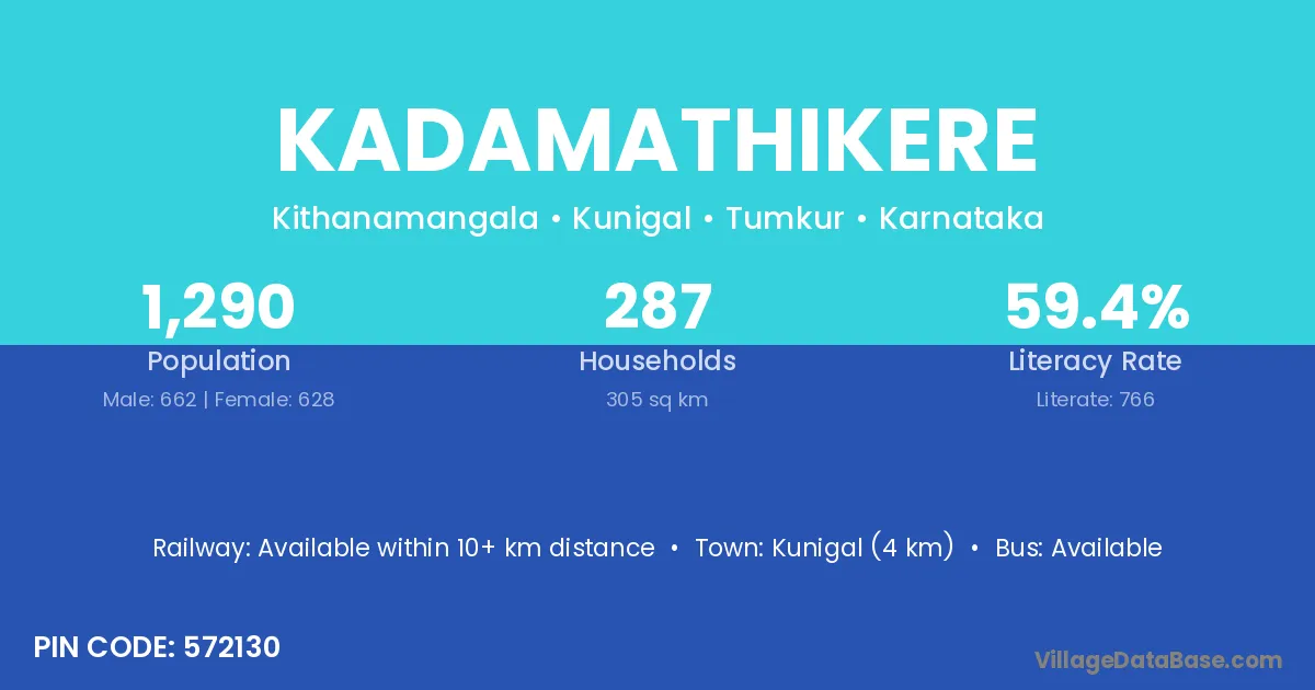 Kunigal (4 km) is the nearest town to Kadamathikere village for major economic activities and is located approximately 4 km away.