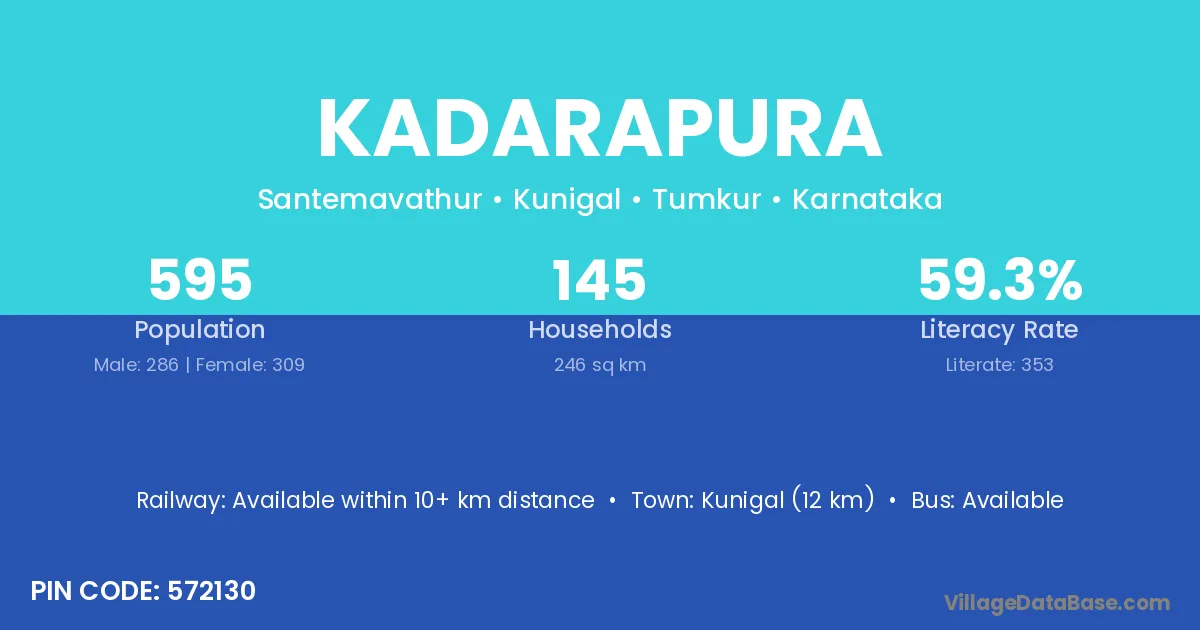 Kunigal (12 km) is the nearest town to Kadarapura village for major economic activities and is located approximately 12 km away.