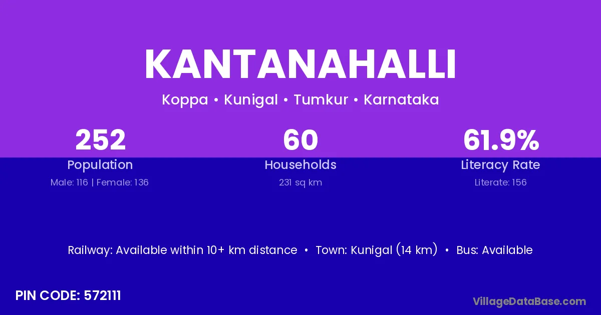 Kunigal (14 km) is the nearest town to Kantanahalli village for major economic activities and is located approximately 14 km away.