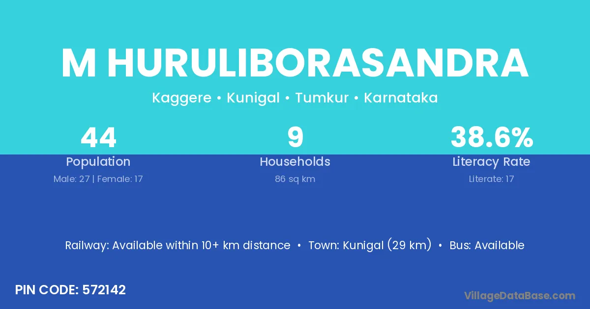 Kunigal (29 km) is the nearest town to M Huruliborasandra village for major economic activities and is located approximately 29 km away.