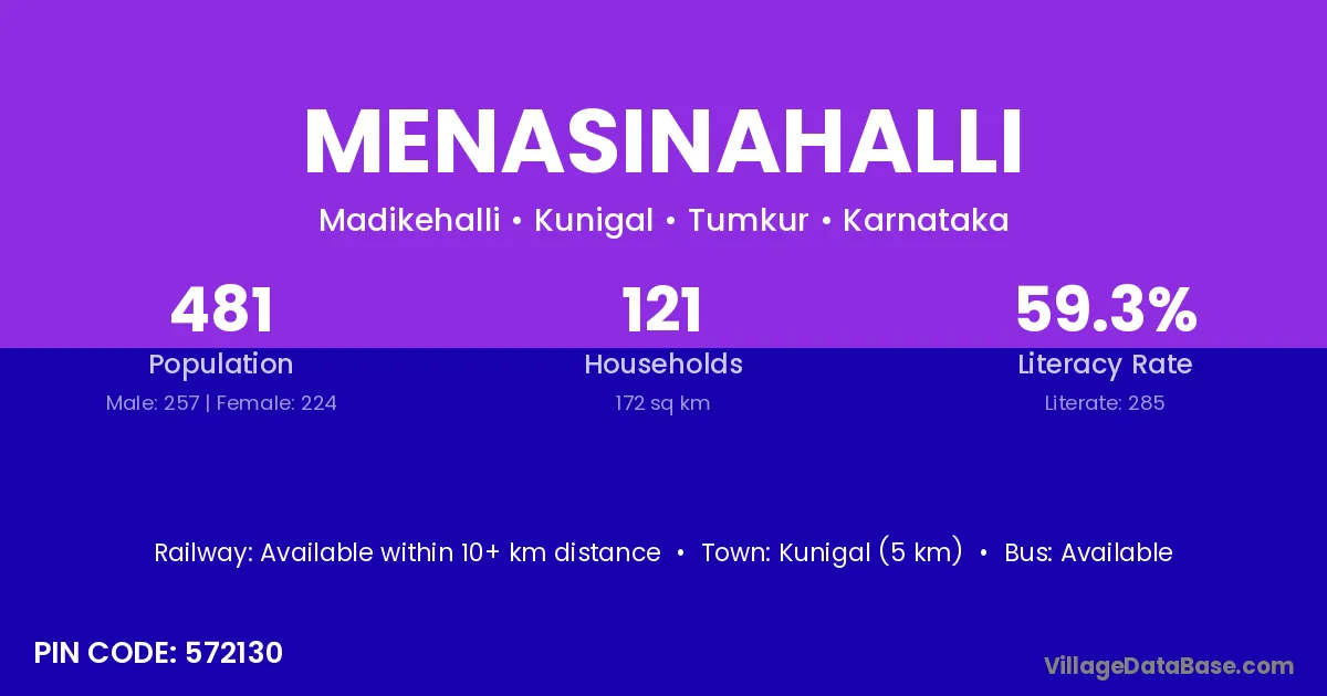 Kunigal (5 km) is the nearest town to Menasinahalli village for major economic activities and is located approximately 5 km away.