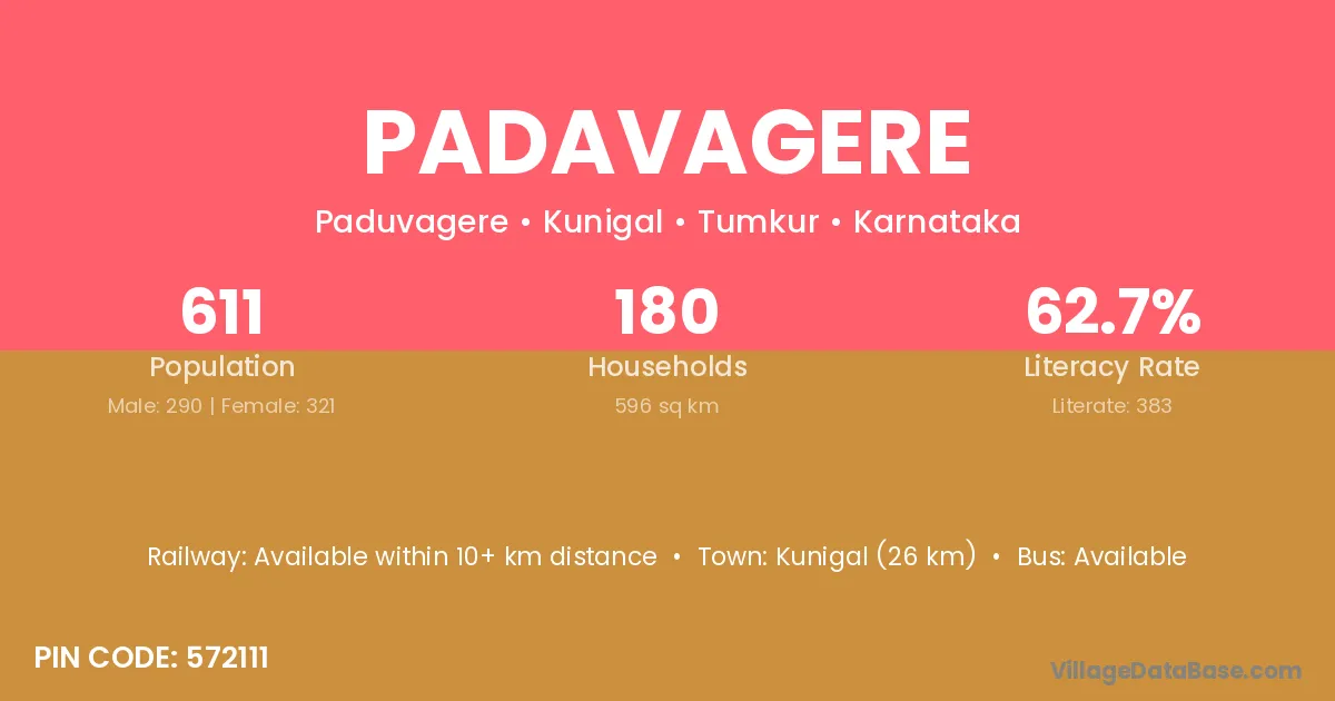 Kunigal (26 km) is the nearest town to Padavagere village for major economic activities and is located approximately 26 km away.